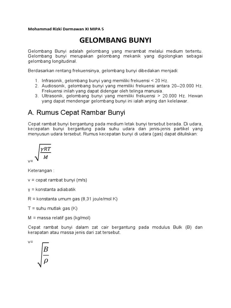 V = cepat rambat bunyi (m/s) γ = tetapan laplace. Rumus kecepatan digunakan untuk mencari kecepatan . Definisi cepat rambat gelombang, rumus matematis cepat rambat bunyi, penjelasan jenis dan sifat bunyi serta resonansi. Di dalam gelombang bunyi yang berperan menjadi medium perantaranya ialah udara. Gelombang bunyi dapat dihitung cepat rambatnya dengan menggunakan rumus cepat rambat gelombang bunyi yang telah ditentukan oleh para .